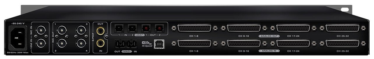 2 ADAT optical inputs; 1 optical input MADI; 2 ADAT optical outputs; 1 optical output MADI; 32 audio line outputs via DB25 connectors; 32 audio line inputs via DB25 connectors; USB 2.0 interface