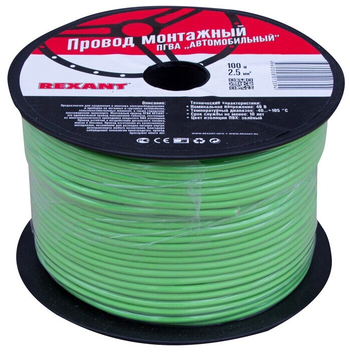 Wire Pgva 1x2.50 mm² coil 100 m green Rexant, 1pc, REXANT, 01-6543