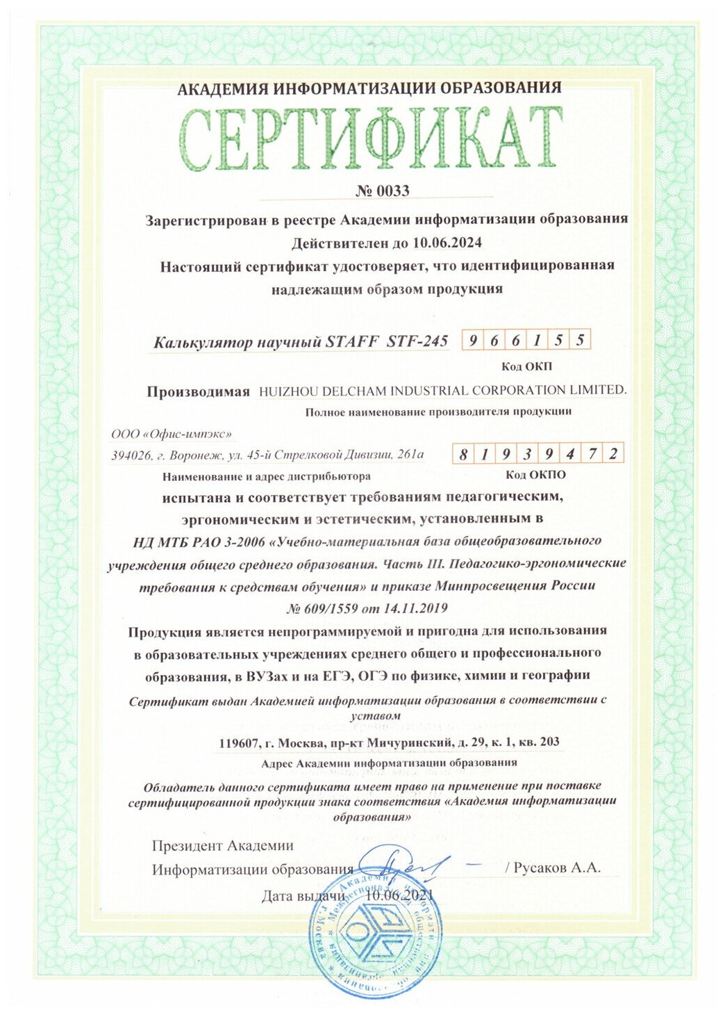 Protective plastic cover; display - liquid crystal; calculator type - engineering; power type - 2 batteries LR54 LR1130/AG10; packaging - cardboard box with euro hanger