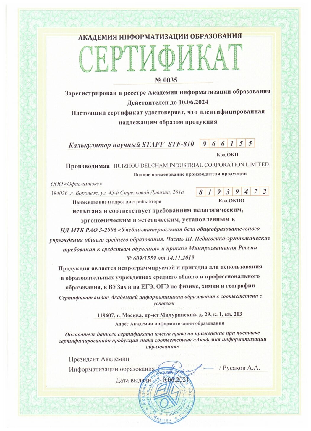 Display - liquid crystal; calculator type - engineering; sliding plastic case; power type - 1 battery LR44 LR1154/AG13; packaging - cardboard box with euro hanger