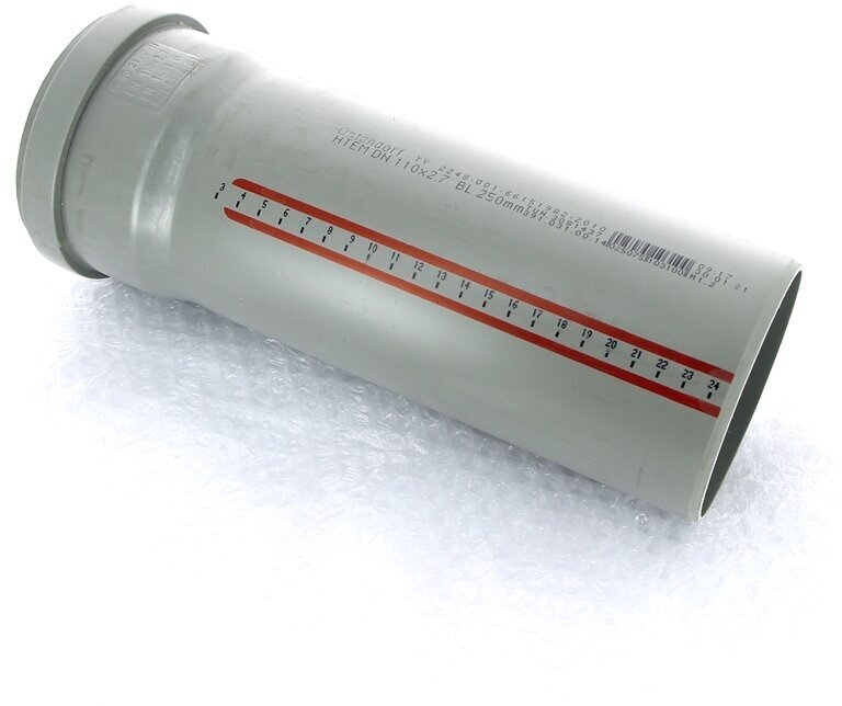 Resistance to aggressive wastewater pH 2 - pH 12, fire resistance according to DIN 4102 class B1; color RAL 7037; the pipes are marked with a centimeter ruler for ease of installation; socket diameter 125 mm, socket length 76 mm
