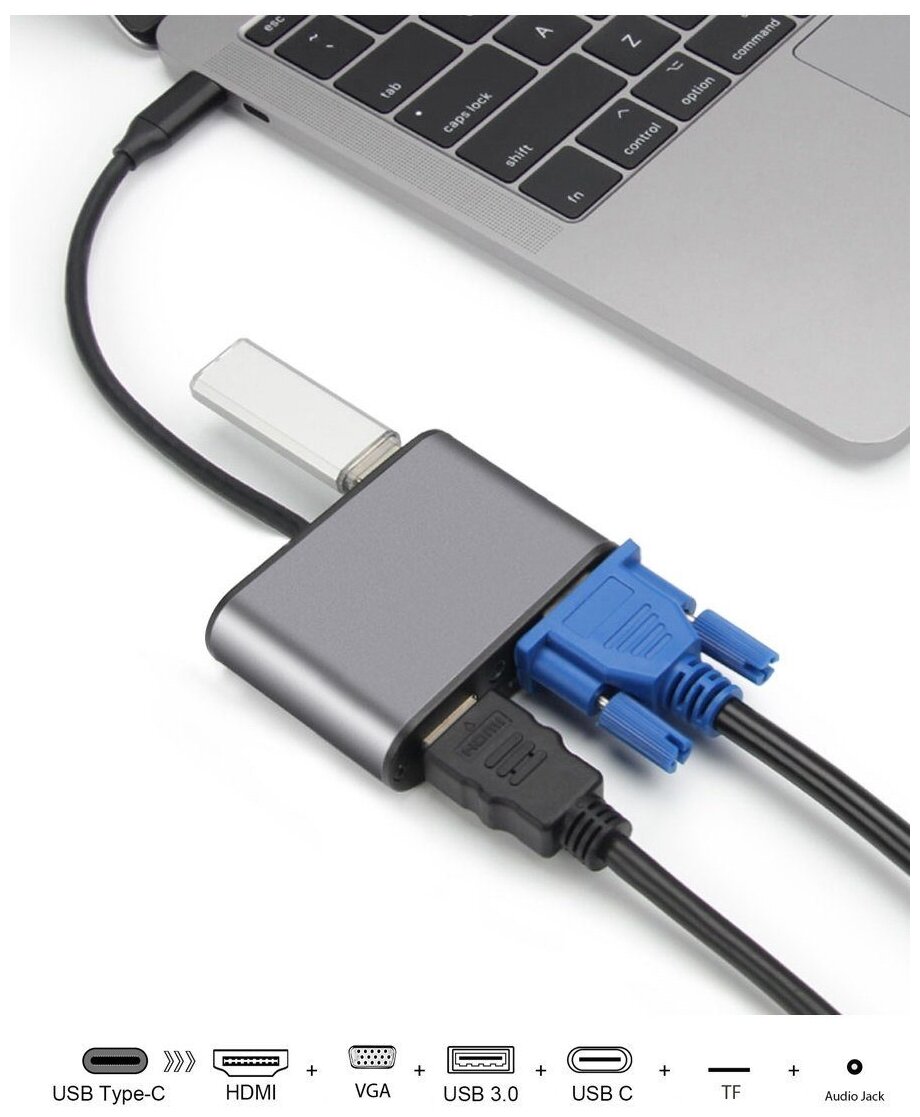 There are connectors VGA 1080P@60HZ, HDMI 2160P@30HZ, mini jack 3.5 mm; designed for devices with a USB Type-C connector that integrates a DisplayPort interface