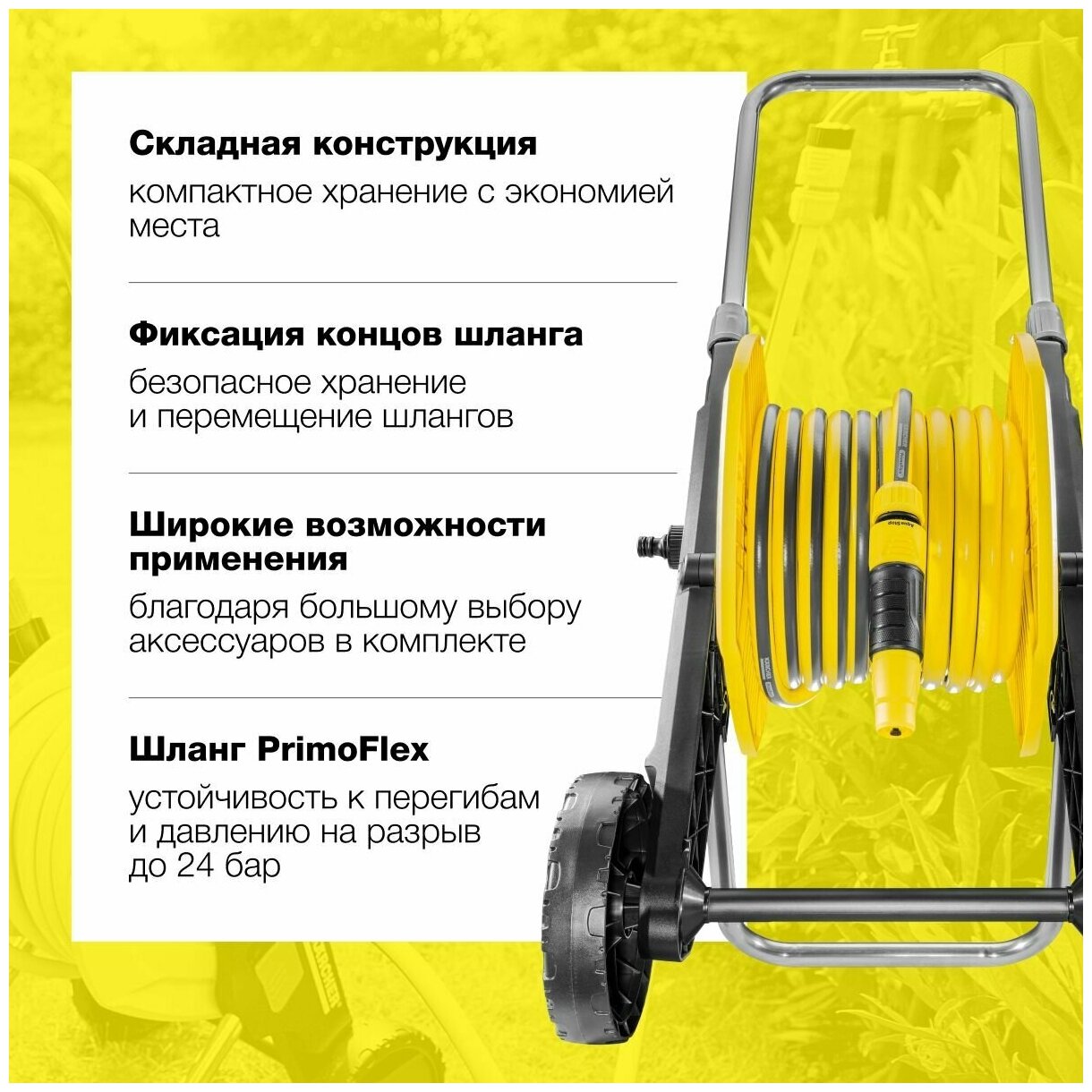 Trolley, hose 1/2-20 m, sprayer for irrigation - 1 pc, connector - 3 pcs, connector with Aqua Stop function - 1 pc, fitting for connecting to a G3/4 tap with an adapter G1/2 - 1 pc