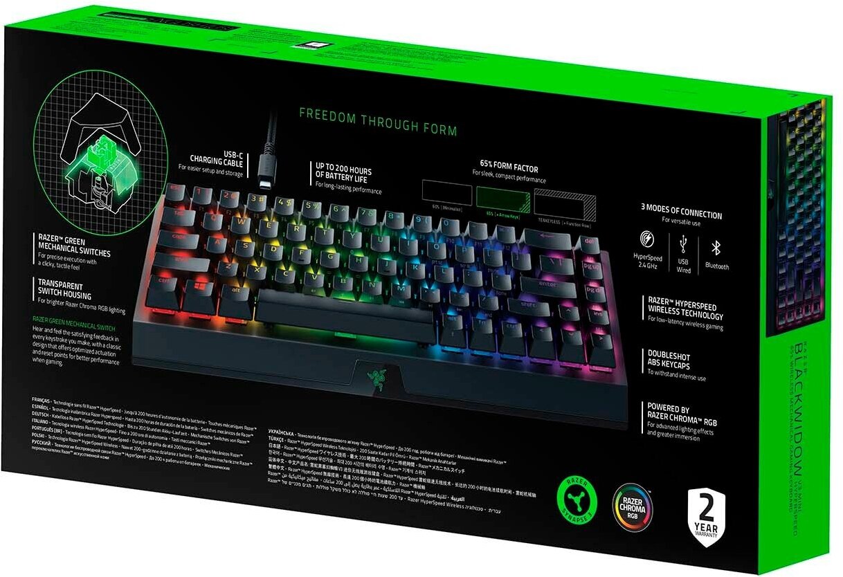 Additional Information: Razer™ HyperSpeed ​​wireless connectivity, customizable Razer Chroma™ RGB backlighting with 16.8 million colors, hybrid onboard memory and cloud storage - up to 5 profiles, dual molded ABS keycaps, support