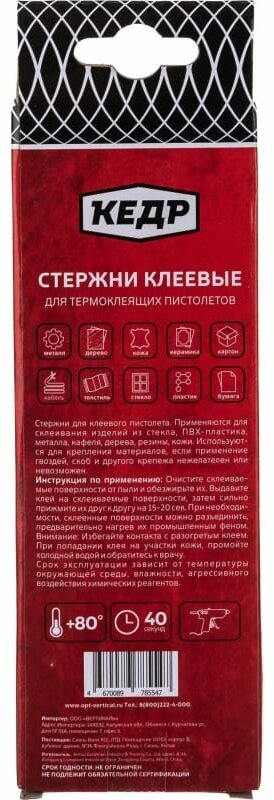 Glue stick diameter: 11 mm, type: sticks, stick length: 200 mm, number of sticks per set: 6 pcs, weight: 115 g