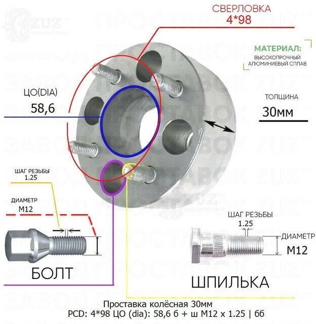 30mm 4*98 TsO 58.6 in the set Bolt + Stud M12*1.25 hub without collar hub 4x98 4x98