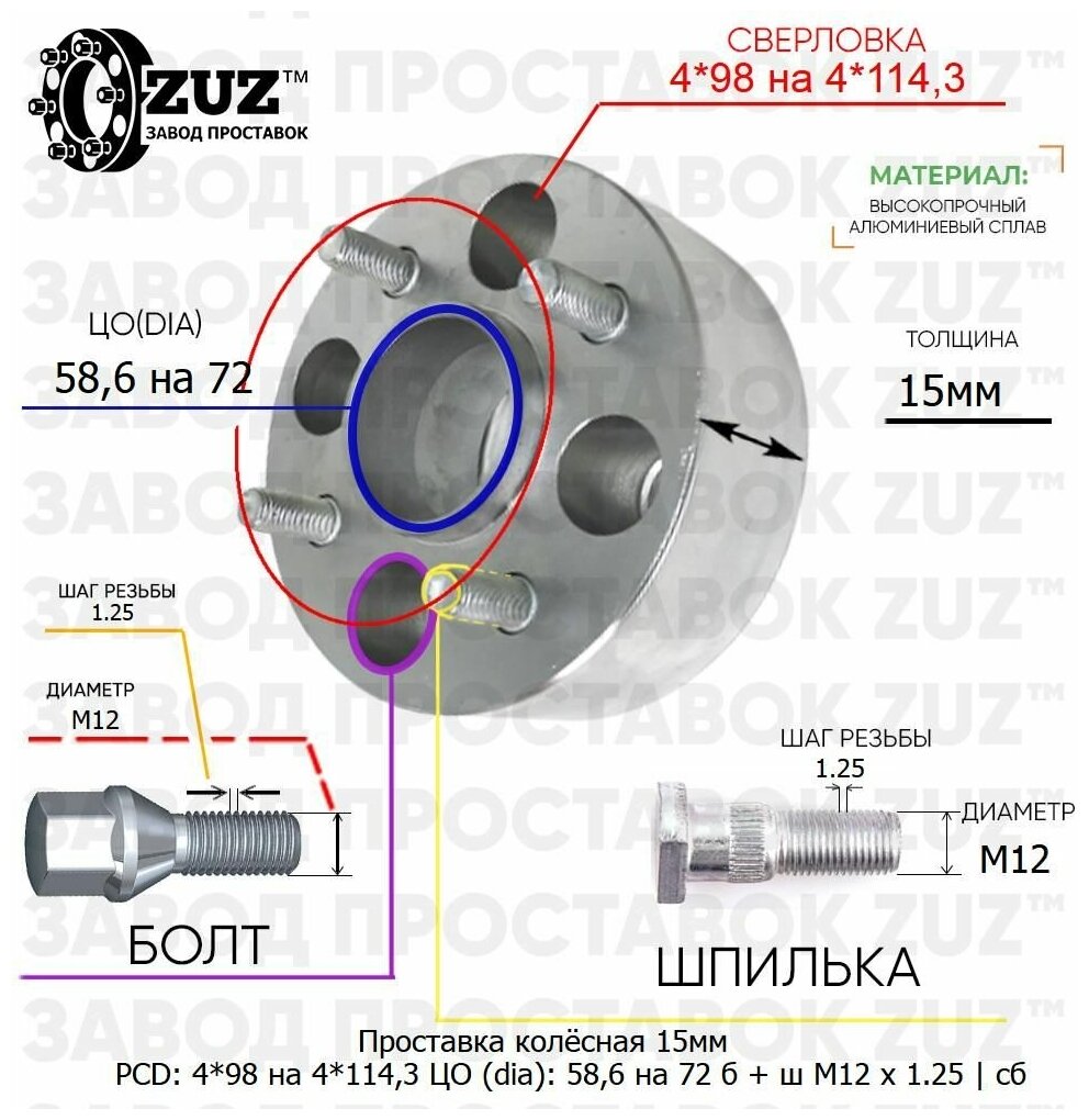 15mm 4*98 4*114.3 CO 58.6 72 in the set Bolt + Stud M12*1.25 hub with collar passing adapter