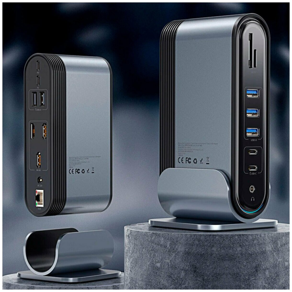 Fast data transmission 5Gbps data transfer, made of aluminum alloy. Compatible with MacBook. Provides 17 different ports for connection. Support USB 3.0, USB-C, Type-C PD 100W, SD + TF memory card, 3.5 mm Jack, 3 x HDMI 4K HD, LAN port / USB Hub USB hub F